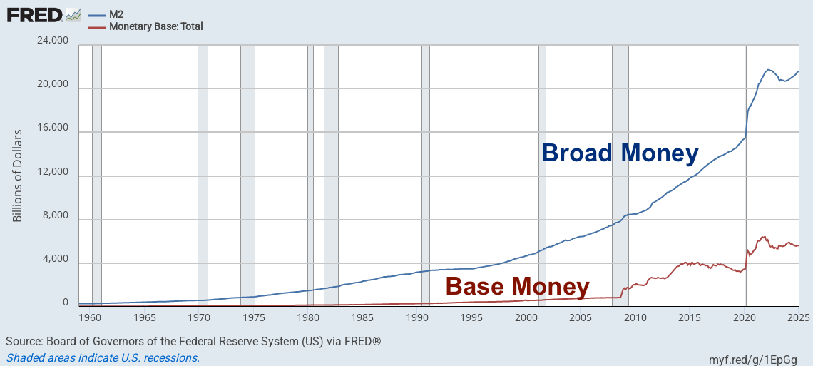 Red line is base money and there's about $5.6 trillion of that. Banks multiplied it into the blue line, which shows there's about $21.5 trillion of broad money.