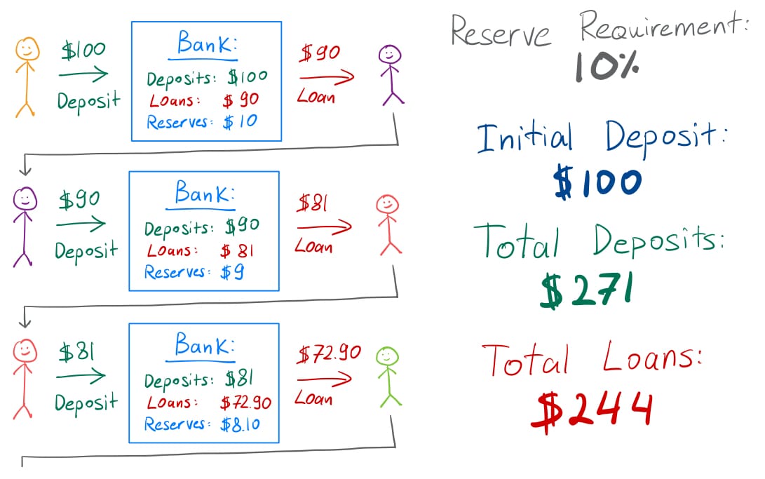 Using an example of $100, the bank has to keep $10 as reserves and can lend out the remaining $90, which becomes a deposit in another bank, like in the process earlier.