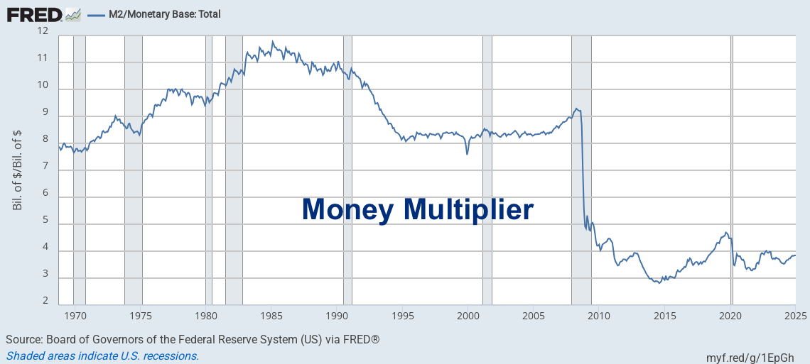 Historically money multiplier has been much higher than where it is now — it sort of fell off a cliff following the 2008 financial crisis. This was a result of regulatory changes that required banks to keep much more reserves than before — i.e. "ample reserve environment".