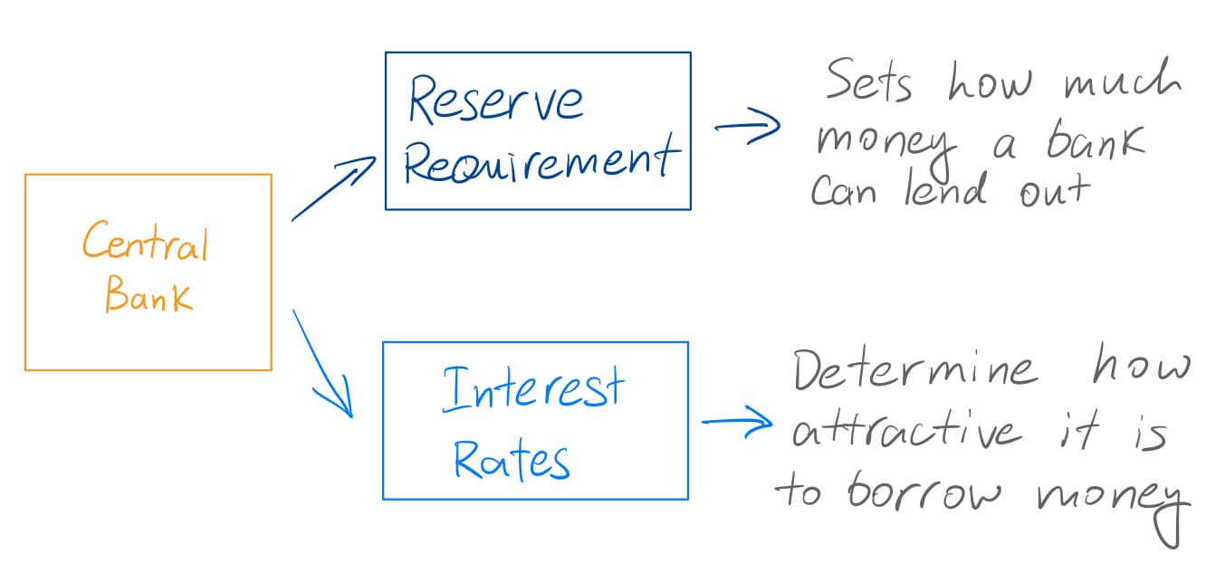 If rates are high, consumers and corporations are discouraged from borrowing, which leads to fewer loans and less money being created by banks and vice versa.