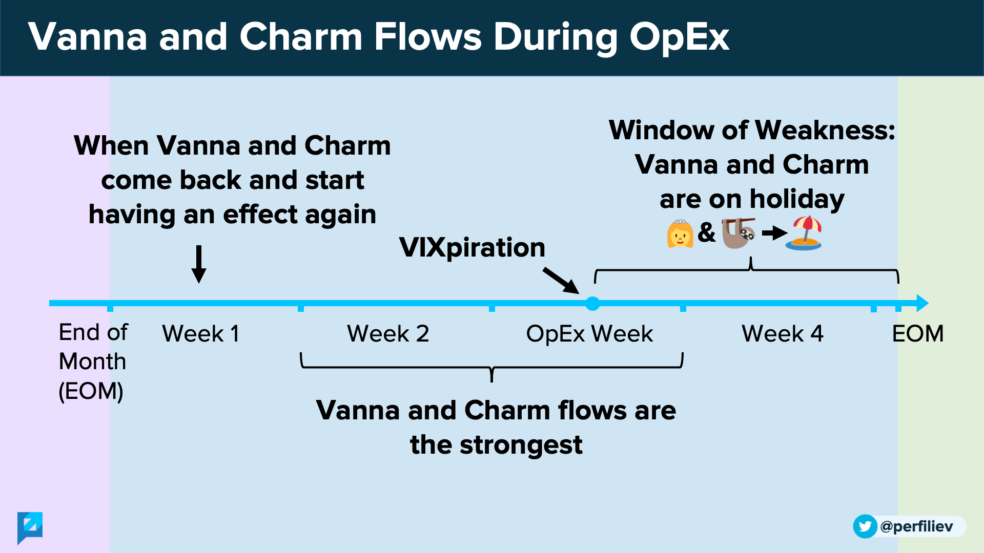 The effects of Vanna and Charm are the strongest during the 2nd and 3rd week of the month - i.e. OpEx week and the week before.