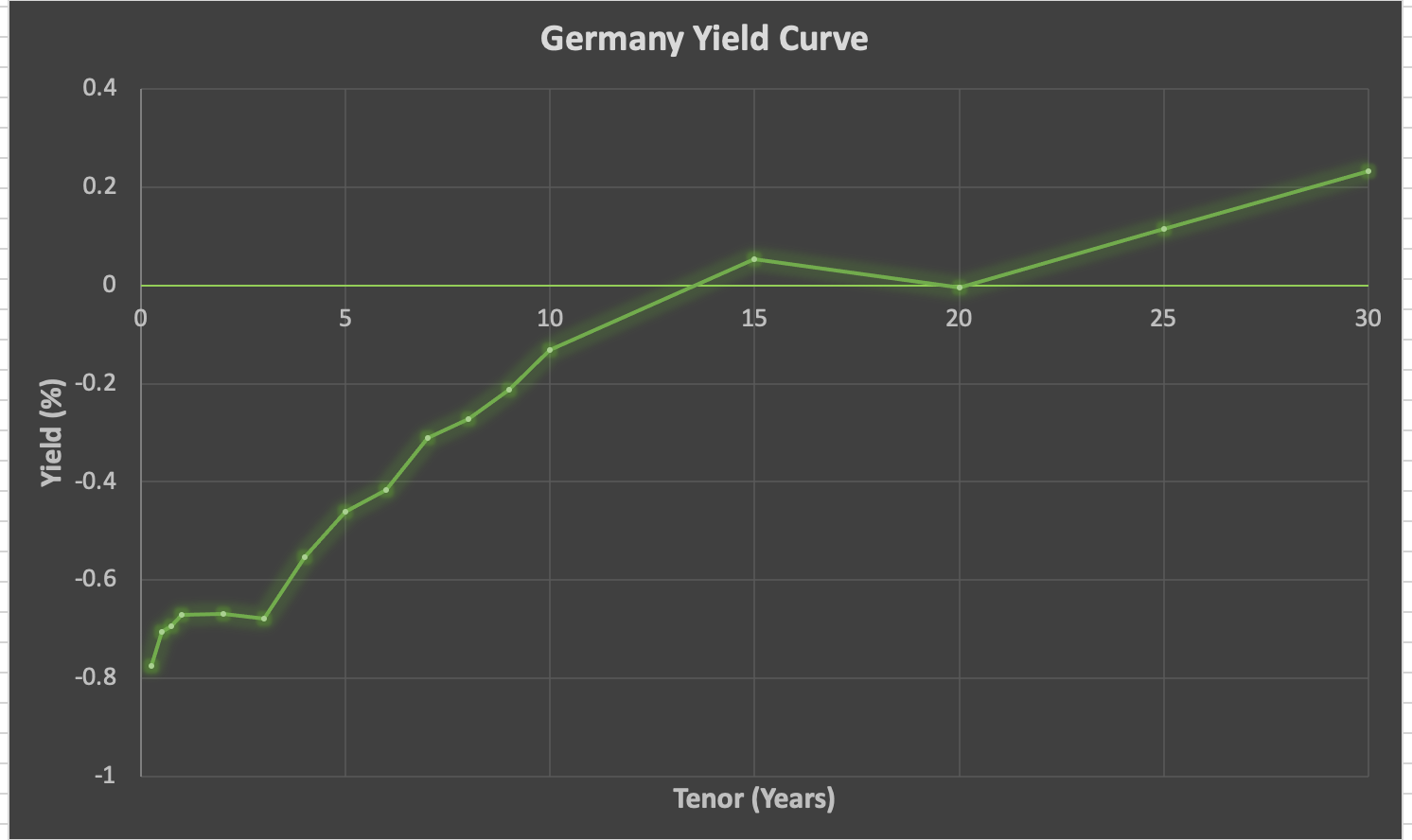 The dip in the German yield curve occurs around the 20Y bond.