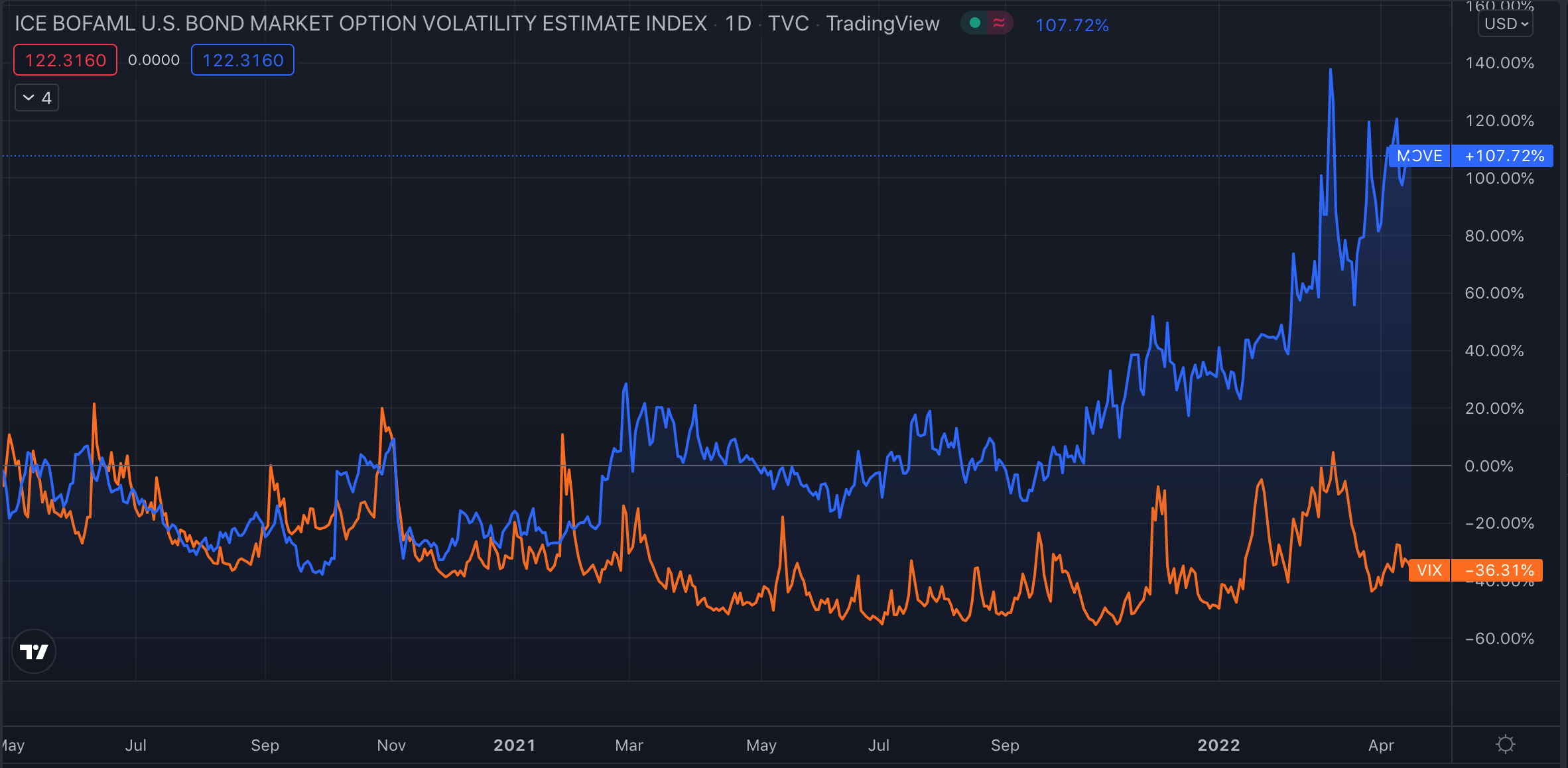 This chart has been doing rounds showing dislocation between SPX implied vol (VIX) and bonds implied vol (MOVE). USTs sold off sharply this year, which is reflected in higher implied vol. SPX is -6.4% YTD, but VIX is about to jump under 20 any minute now.