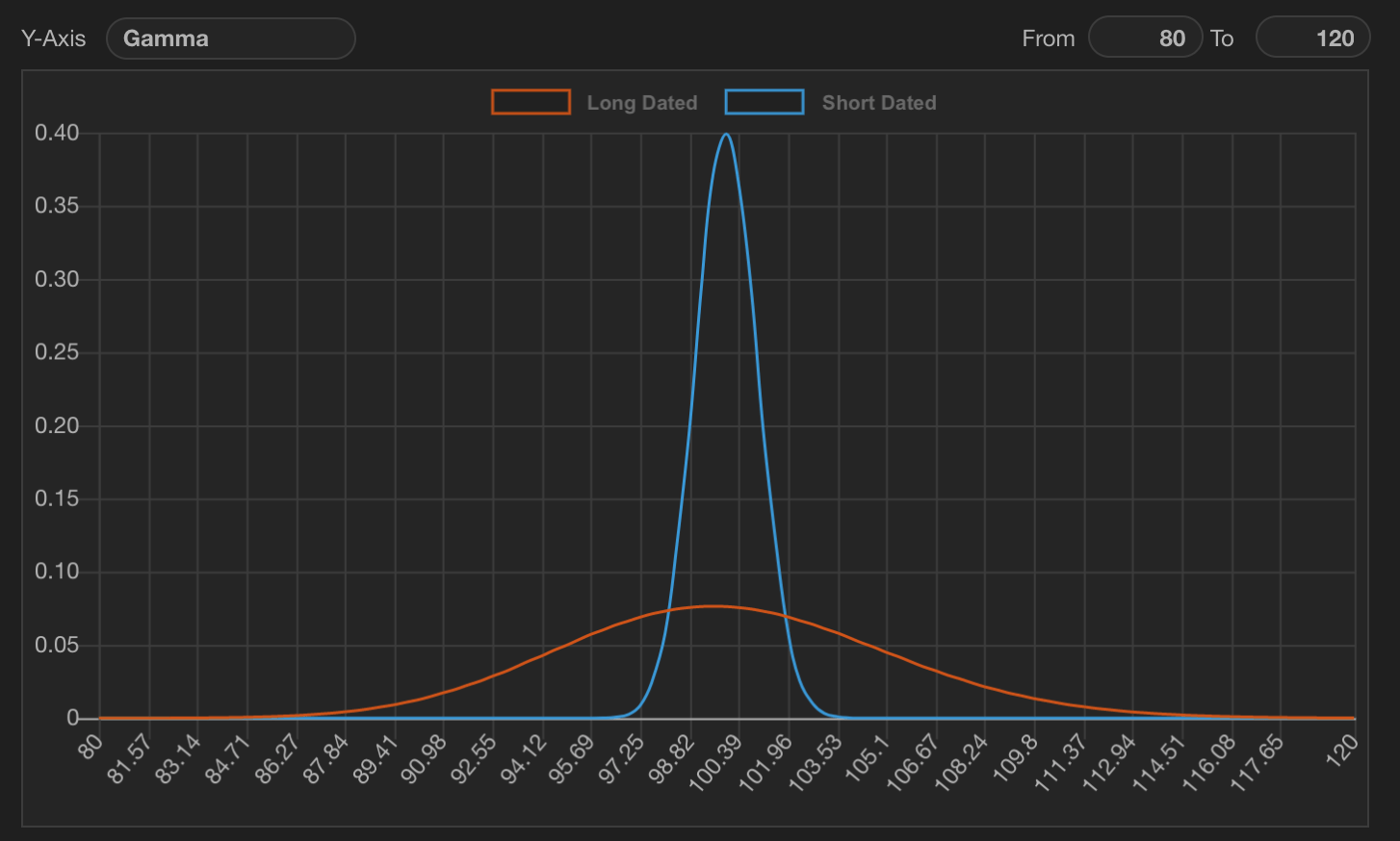 For any single option, gamma is a bell-shaped curve centered around the strike. And it's the highest for short-dated, at-the-money (ATM) options: