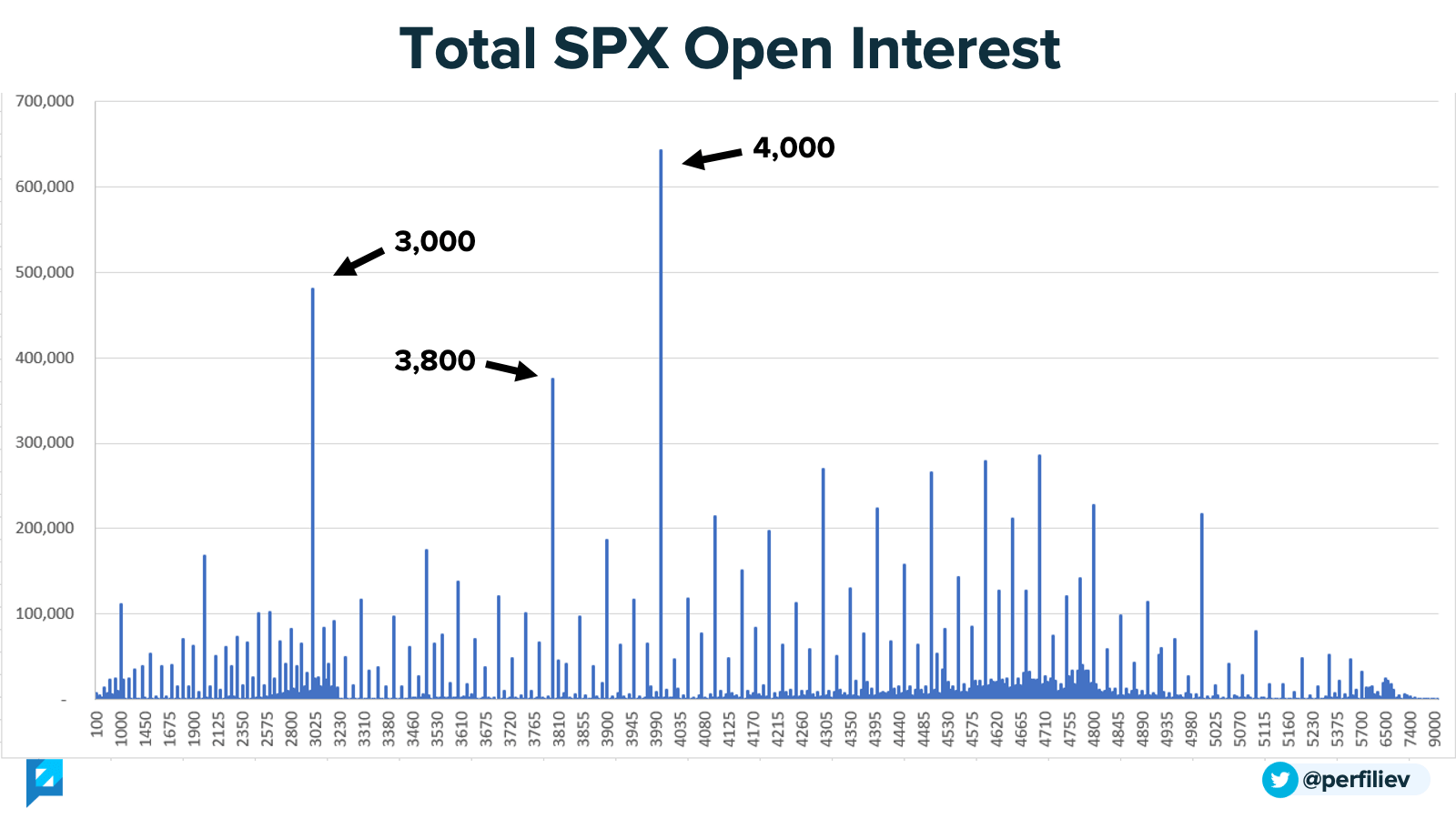 The most open interest is frequently concentrated around large expiries and nice, round strikes:
