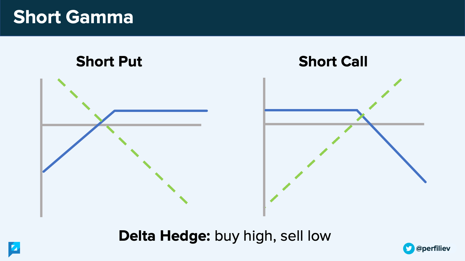 When the street is short gamma, the opposite happens. Dealers' book is short options, and they "buy high, sell low". This exacerbates market moves and removes liquidity (frequently, when it's needed the most).
