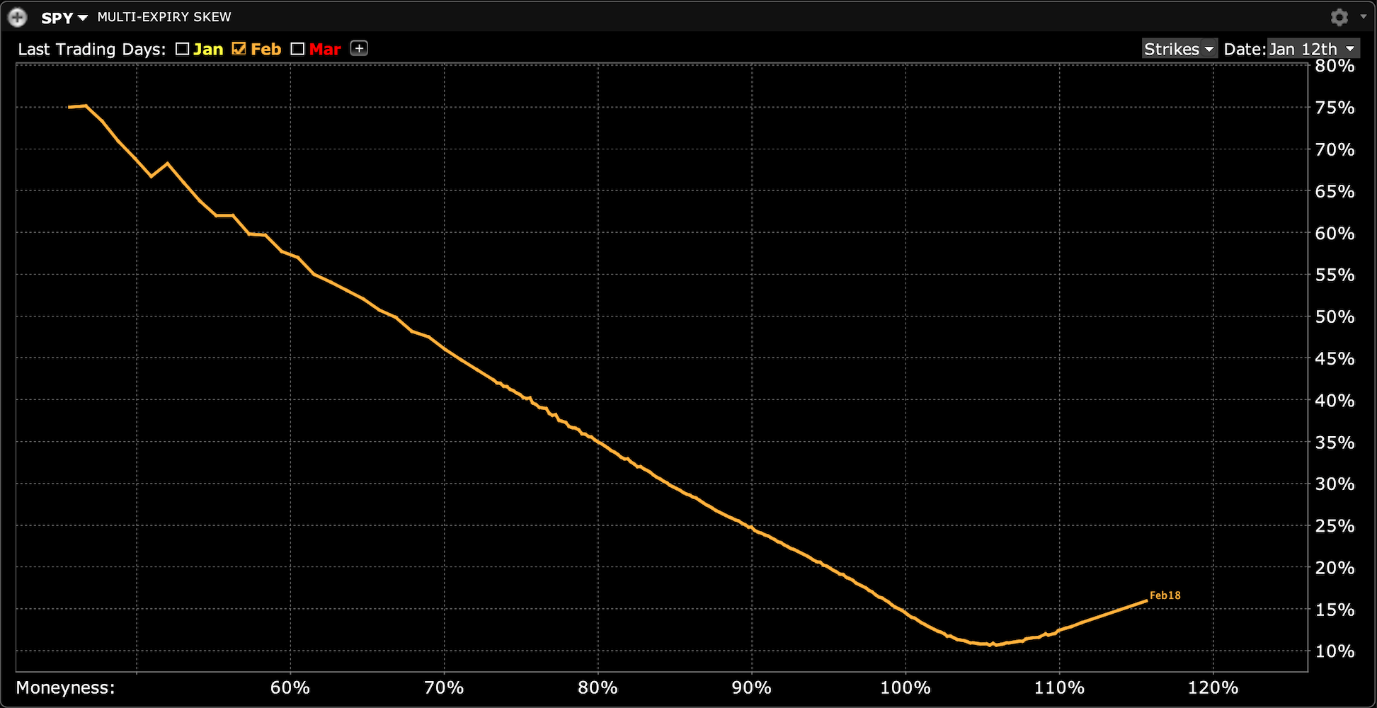 On an index level, it is generally believed that investors predominantly buy puts for protection and sell calls as part of overwriting strategies. This is evident in the $SPX skew, which shows higher implied volatility for puts than calls.