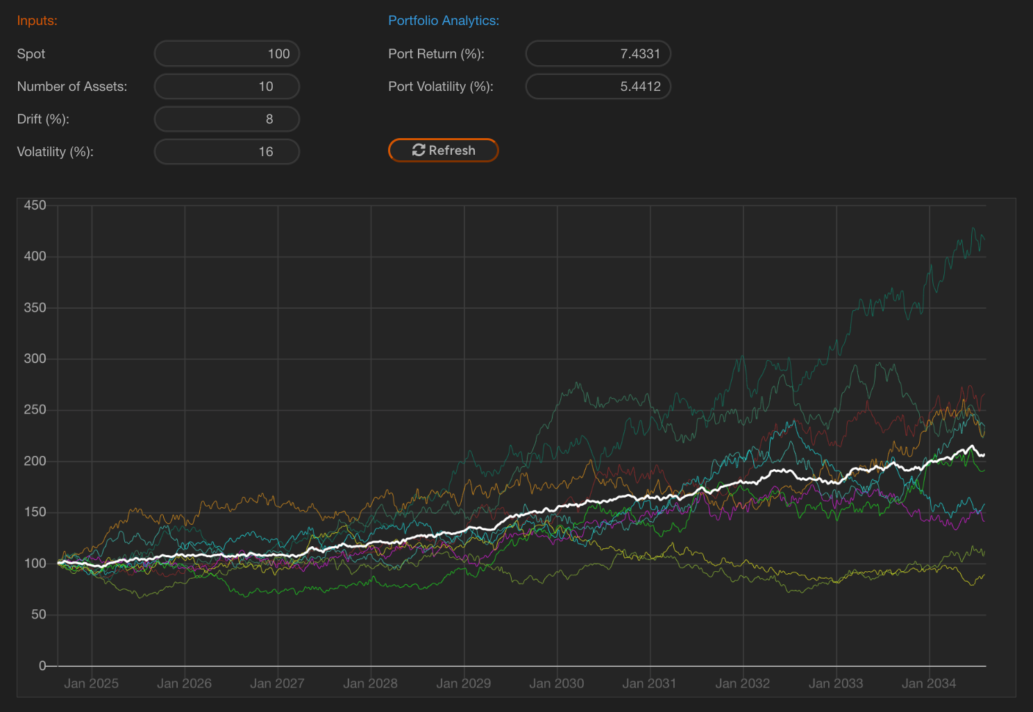 Monte Carlo portfolio simulation showing the impact of diversification on portfolio returns and volatility.